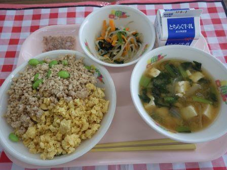 今日の給食は、二色丼(麦入りごはん)・牛乳・おひたし(かつおぶし)・味噌汁です。