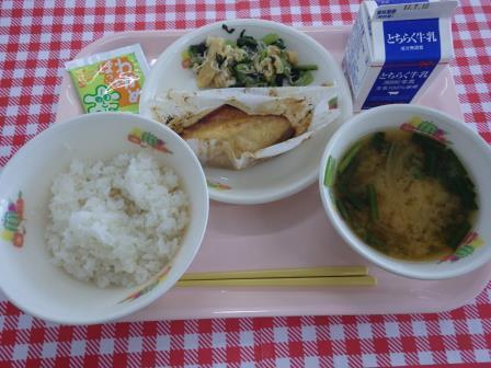 今日の給食は,麦入りごはん・牛乳・さわらの西京焼き・おひたし・こんにゃくのきんぴら・ひじきふりかけです。