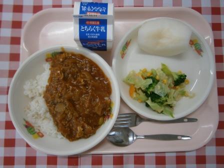 今日の給食は,玄米ごはん・キーマカレー・牛乳・サラダ・国産レモンゼリーです。