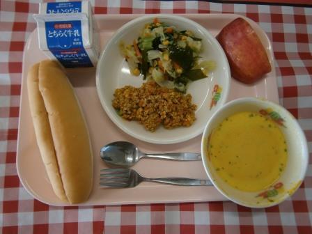 今日の給食は,麦入りごはん・牛乳・かぼちゃコロッケ(ソース)・ゆでキャベツ・味噌汁・のりの佃煮です。