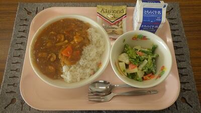 麦入りご飯・牛乳・ひき肉と豆のカレー・こんにゃくサラダ・アーモンドカルです。