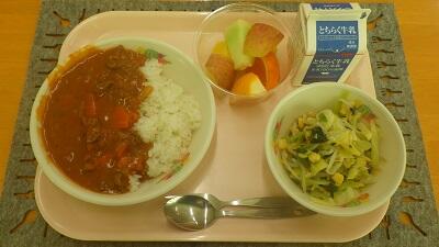 今日の給食は,麦入りご飯・牛乳・ポークカレー・こんにゃくサラダ・おたのしみチーズです。
