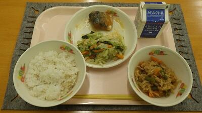 今日の給食は,麦入りご飯・牛乳・さばの味噌煮・ゆで野菜・切り干し大根の炒め物です。