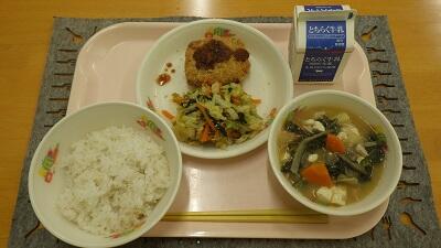 今日の給食は,麦入りご飯・牛乳・ハンバーグ・和風きのこソース・みそけんちん汁・アセロラゼリーです。
