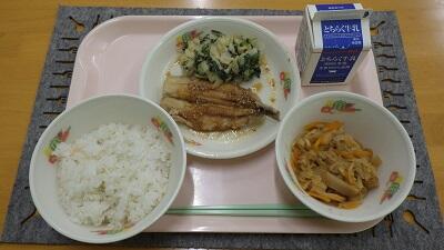 今日の給食は,麦入りご飯・牛乳・白身魚の三味焼き・ごまあえ・みそ汁です。