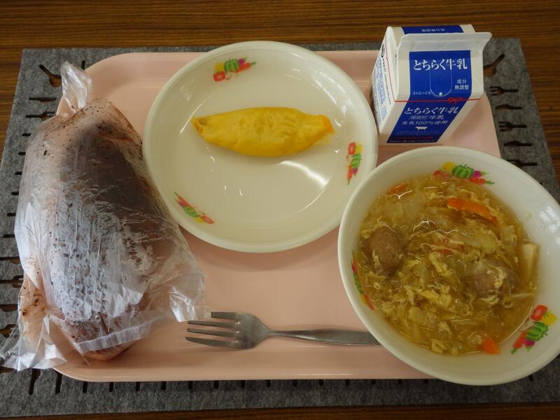 今日の給食は,ココア揚げパン・牛乳・ツナマヨオムレツ・肉団子スープです。