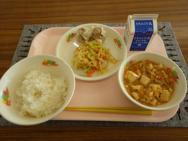 今日の給食は,麦入りご飯・牛乳・ポークシューマイ・春雨とにらの炒め物・わかめスープです。