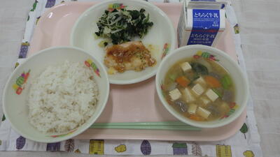今日の給食は,麦入りごはん・牛乳・鶏肉のみそチーズ焼き・いそべあえ・いものこ汁です。