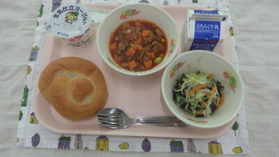 今日の給食は,米粉パン・牛乳・チリコンカン・ゆで野菜・県産ヨーグルトです。