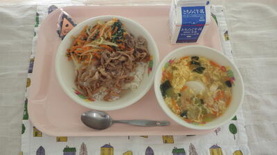 今日の給食は,麦入りごはん・牛乳・ビビンバ丼・トックスープ・まんてん黒豆です。