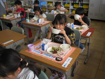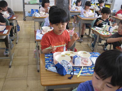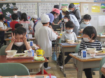 給食当番の児童は、初日から配膳をがんばっていました。担任の先生が「ご飯を増やしてほしい人いますか」と声をかけると、多くの児童が「はーい」と手を挙げるなど、給食を楽しみにしている様子がうかがえました。これからも、安全安心でおいしい給食を提供していきます!