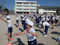 30日、雲一つない快晴の下、東校運動会のため全学年で全体練習1回目を行いました。