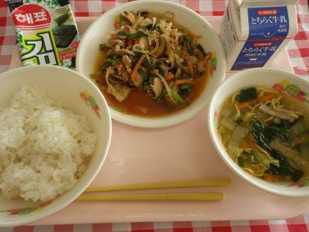 今日の給食は,麦入りごはん・牛乳・プルコギ風炒め物・中華風スープ・韓国のりです。