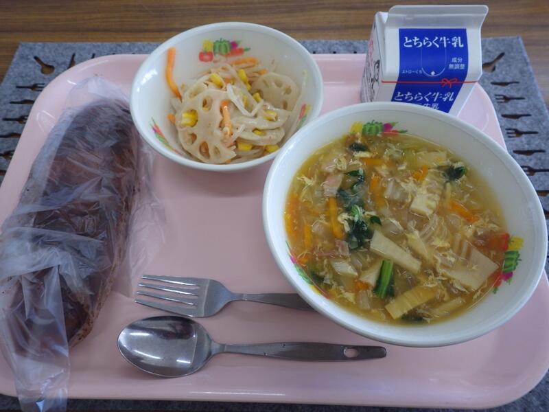 今日の給食は、米粉パン・牛乳・かんぴょうグラタン・ゆで野菜・ミネストローネスープ・キャラメルクリームです。