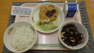 今日の給食は,麦入りご飯・牛乳・ハムカツ・ボイルキャベツ・ひじきと大豆の炒り煮・味付けのりです。