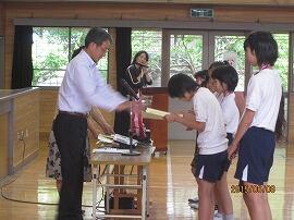 東ビクトリーズの選手の皆さんには,「東日本少年野球交流大会 準優勝」の賞状と準優勝カップ,メダルを手渡しました。表彰の後で,「豊かな心をもち思いやりのある子」について,子どもたちに10の質問(日常生活の中でのあいさつや言葉遣い,友達への心遣いなど)をしながら話をしました。