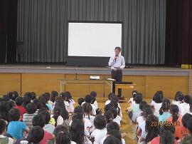 真夏を思わせるような天候に恵まれ,今年のプール開きが行われました。業間休みの時間に全校生が体育館に集まり,体育主任の大野先生からプールの約束や目標等について話を聞きました。