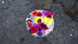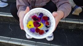 連日の冷え込みにより,校庭では冬ならではの光景が見られています。現在,子供たちは「氷のアート」作りに取り組んでいます。前日に用意した容器に,色とりどりの花びらなどを添えて一晩置くと,翌朝には厚さ1cmほどの氷の作品に大変身。自然の冷気を利用した創作活動に,子供たちは夢中になっています。