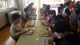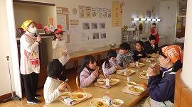 今年最後の給食は,クリスマスメニューでした。ケーキやドーナツなど,子供たちがセレクトしたものをサンタクロースや雪だるま,トナカイから手渡されました。突然の登場で,みんな驚きを隠せませんでした。その後は,みんな笑顔で,今年最後の給食をおいしく味わっていました。