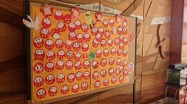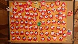 地域学校協働活動推進員の皆様のご協力により,昇降口の「懐かしい風景前広場」に,手作りの達磨の福笑いが掲示されました。推進員の方々が,目・眉・ひげといったパーツを一つ一つ丁寧に準備してくださり,それを使って子供たちや教職員が思い思いの顔を完成させました。個性あふれる達磨たちが勢ぞろい。 一つとして同じ顔はなく,広場を通る人たちの心を和ませてくれています。