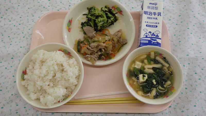 麦入りごはん 牛乳 スタミナ焼き さっぱりあえ 味噌汁