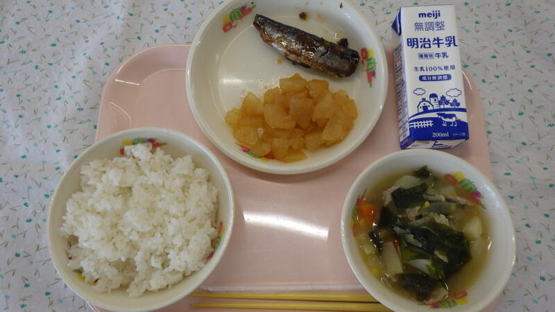 麦入りごはん 牛乳 いわしの生姜煮 冬瓜のキムチ和え 道産子汁