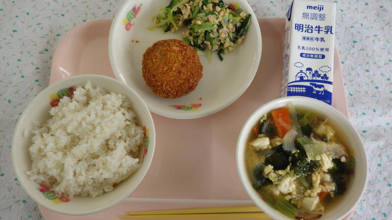 麦入りごはん 牛乳 メンチカツ 納豆和え チンゲン菜と豆腐のかきたまスープ