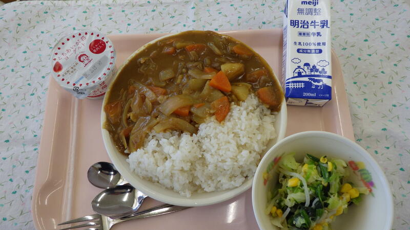 麦入りごはん 牛乳 ポークカレー ゆで野菜 県産いちごヨーグルト