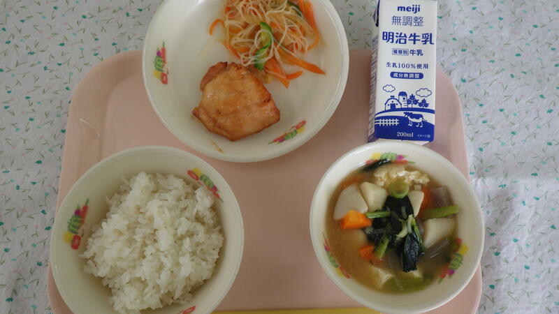 麦入りごはん 牛乳 鶏肉の味噌焼き 辛し和え いものこ汁