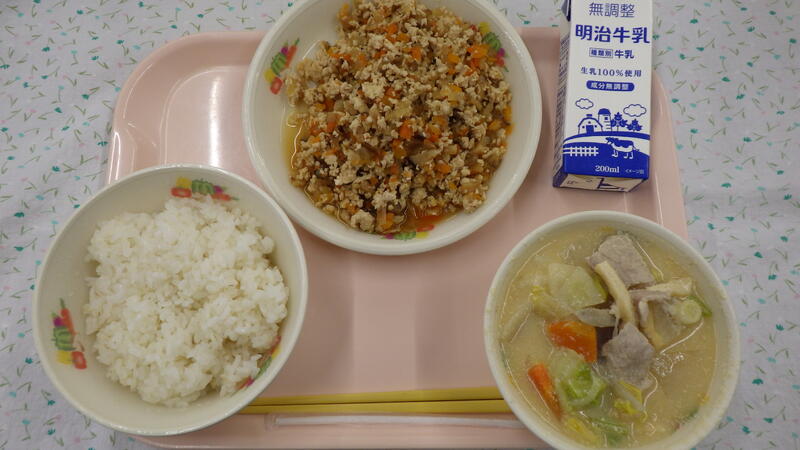 麦入りごはん 牛乳 セルフ鶏そぼろ丼 豆乳仕立ての味噌汁