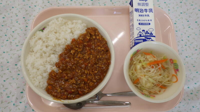 麦入りごはん 牛乳 キーマカレー 湯で野菜