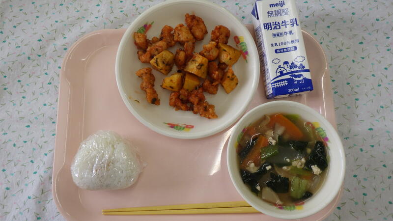 おにぎり 牛乳 鶏肉とさつまいものケチャップあえ 冬瓜スープ