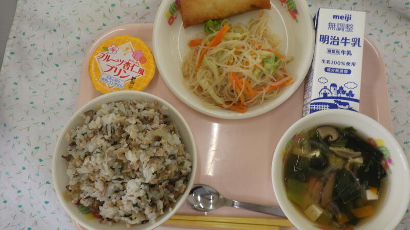 餃子めし 牛乳 春巻き バンサンスー チンゲン菜と豆腐のスープ フルーツ杏仁風プリン