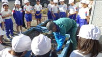 まずは,印南様からレンコンの茎や根の秘密を教えていただきました。次に,「ガンバレ,ガンバレ」と応援しながら,大きなレンコンを水の中から引き上げていただいき,皆できれいに洗って泥を落としました。参観くださった保護者の方々,ありがとうございました。