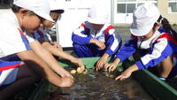 2年生は,地域協議会委員の 印南 洋造 様 のご協力をいただいて5月1日にレンコンの苗植えを行いました。12月1日には,学校内で7か月間,大切に育ててきたレンコンの収穫を行い,12月2日の給食で,全校児童が味わいました。