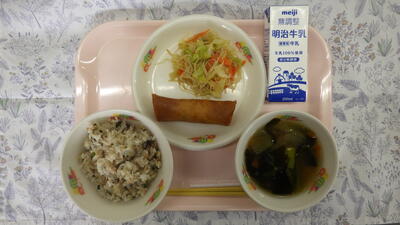 牛乳 麦入りごはん 焼き鳥風あえ物 根菜の味噌汁
