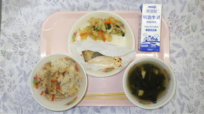 五目ごはん 白身魚の西京焼き ごま酢あえ 豆腐のすまし汁
