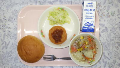 牛乳 キャラメル揚げパン わかめサラダ 野菜とウインナーのスープ煮