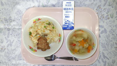牛乳 えびピラフ もみの木ハンバーグ カラフルスープ