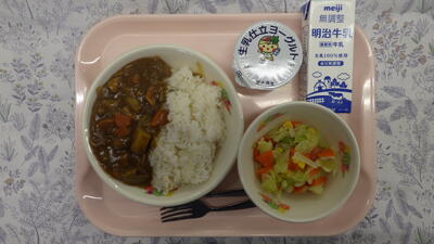牛乳 麦入りごはん チキンカレー フレンチサラダ ヨーグルト