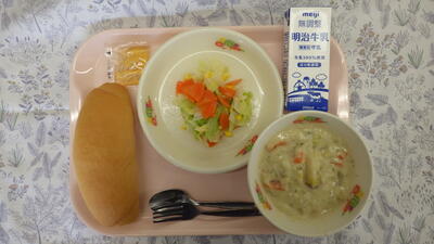 牛乳 コッペパン りんごジャム さつまいものシチュー ゆで野菜