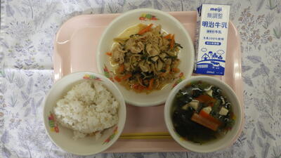 牛乳 麦入りごはん プルコギ風炒め物 豆腐の中華スープ