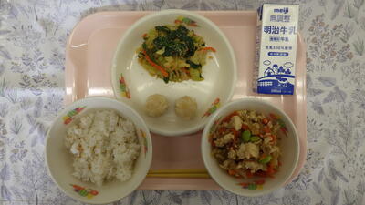 牛乳 ミートソーススパゲティ ゆで野菜 ごまなしミニフィッシュ