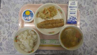 麦入りごはん さんまの蒲焼き おひたし 味噌けんちん汁 お月見デザート