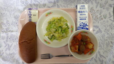 牛乳 黒パン ソフトチーズ ミートボールと野菜のトマト煮 オクラサラダ