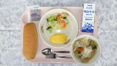 ・コッペパン いちごジャム 牛乳 白身魚とベーコンのホイル焼き ゆで野菜 ミネストローネ