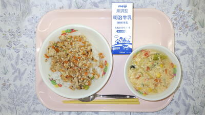 牛乳 鶏そぼろ丼 トマト卵中華スープ