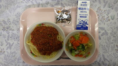 牛乳 ミートソーススパゲティ ゆで野菜 ごまなしミニフィッシュ