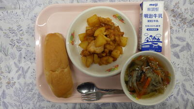 りんごパン 鶏肉とじゃがいものケチャップあえ 野菜スープ