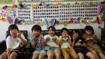 児童の皆さんに,校長室の飾りを折り紙で作ってもらいました。ありがとうございました。写真は,集まってくれた皆さんです。